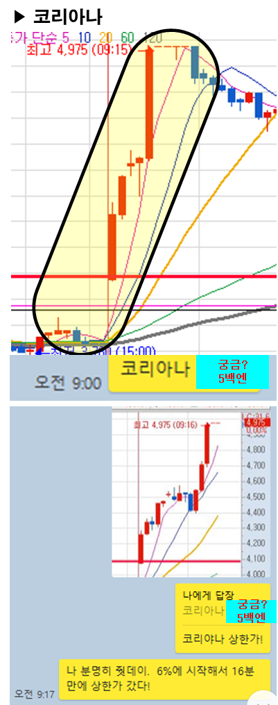 코리아나는 6%상승출발이후 단 18분만에 상한가에 진입한 대박 종목입니다. 대화내용을 보시면 9시부터 언급하기 시작했다는 점을 알 수 있으며 그대로 상한가에 직행한 흔적이 고스란히 담겨있습니다.